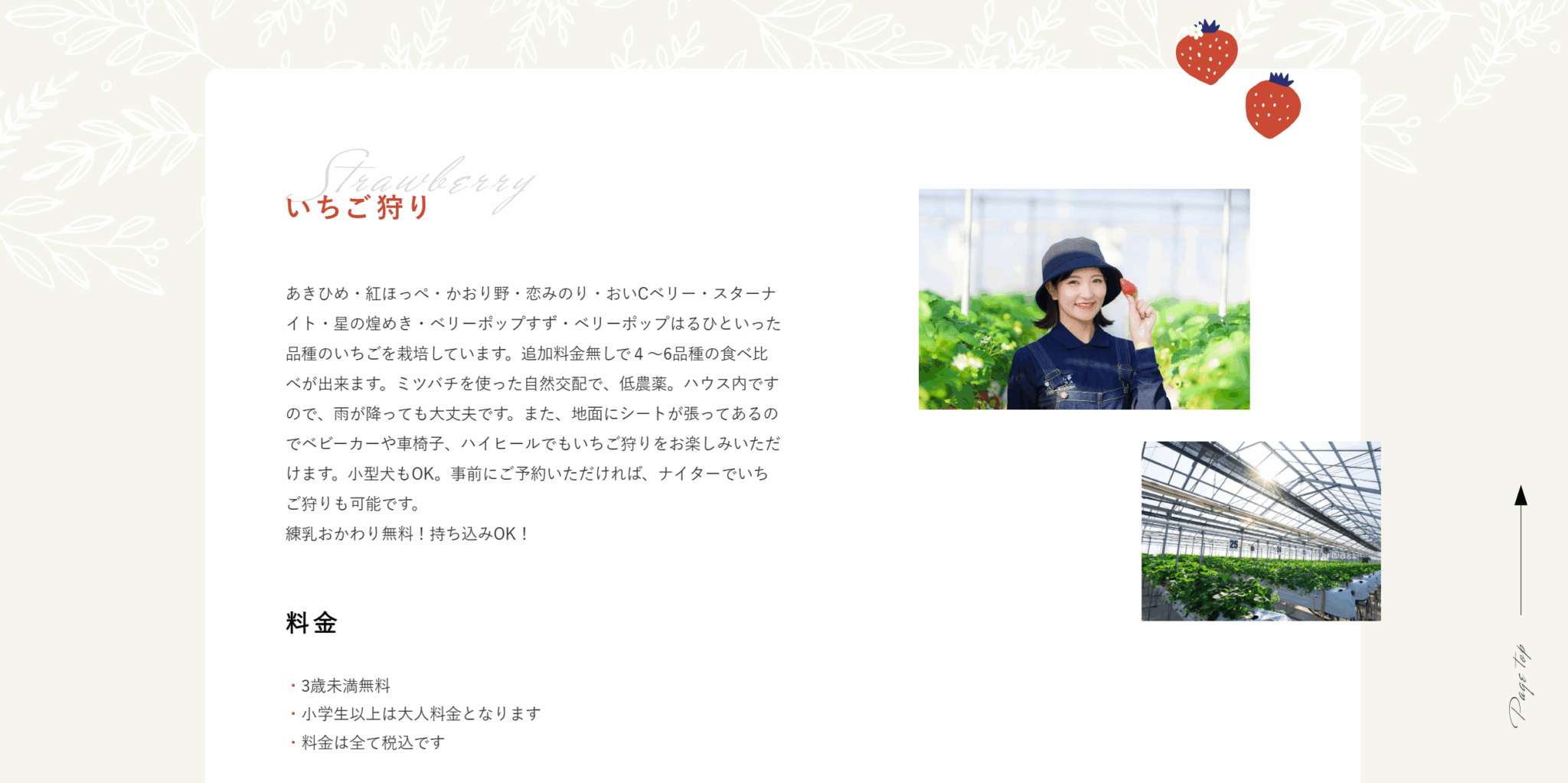 | 営業時間 | いちご狩り:【平日】10:00~13:30 /【休日】9:00~13:30 ※施設:【平日】10:00~15:00 /【休日】9:00~15:00 |