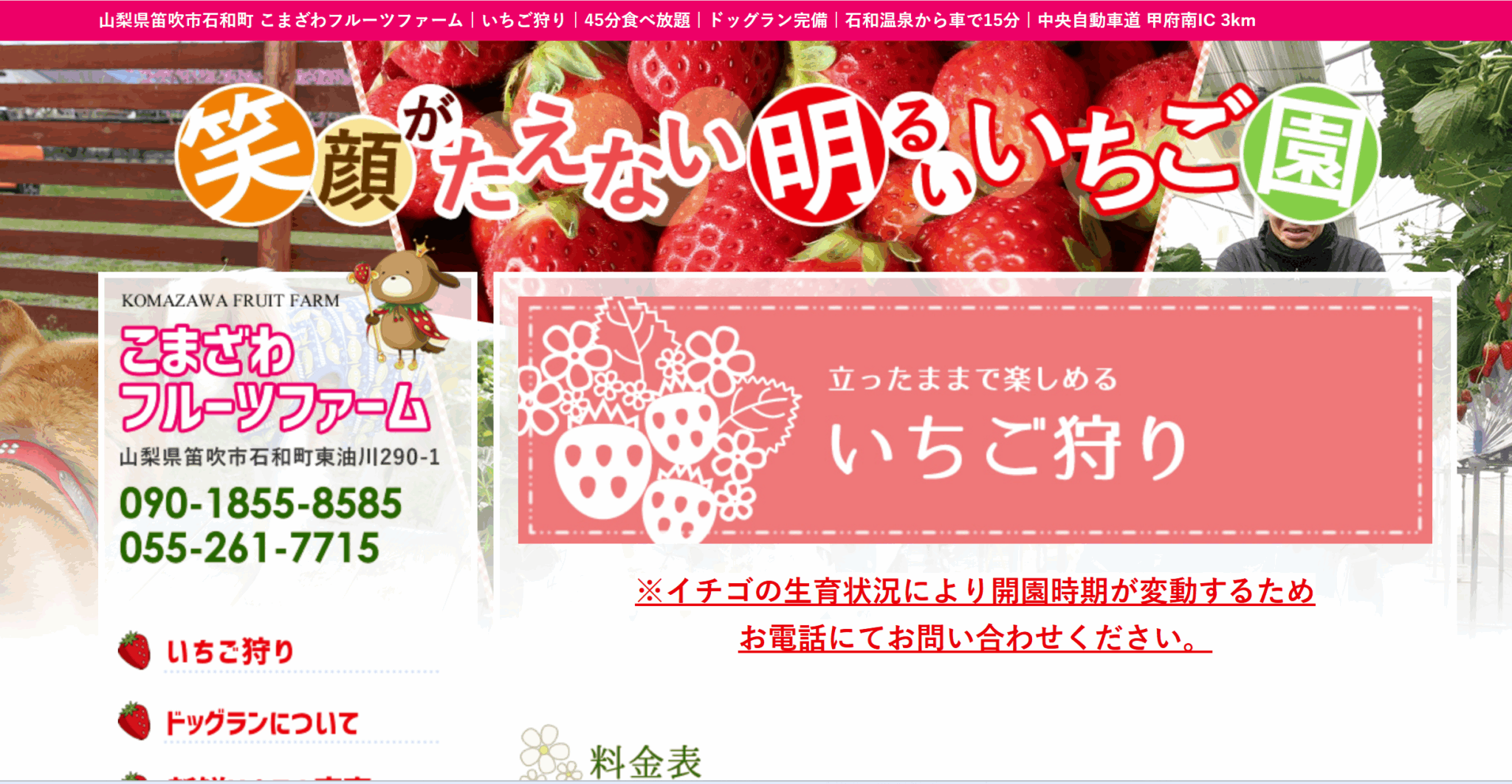 こまざわフルーツファームのいちご狩りに関する情報は、以下の表でご確認ください。ワンちゃん同伴の際は、事前に農園へご確認ください。